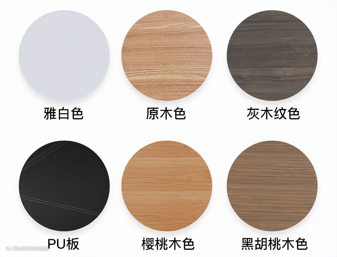 因此,与其说挑选“桌面材质”,不如说挑选“桌面颜色”,因为复合板都是通过不同的颜色,来模拟不同木料质感的。比如乐歌常见的桌板配色有:白板、樱桃木纹、原木色、黑胡桃木纹;北弧常见的桌板配色有:雪岩白、莱茵黄和摩卡棕 ▲