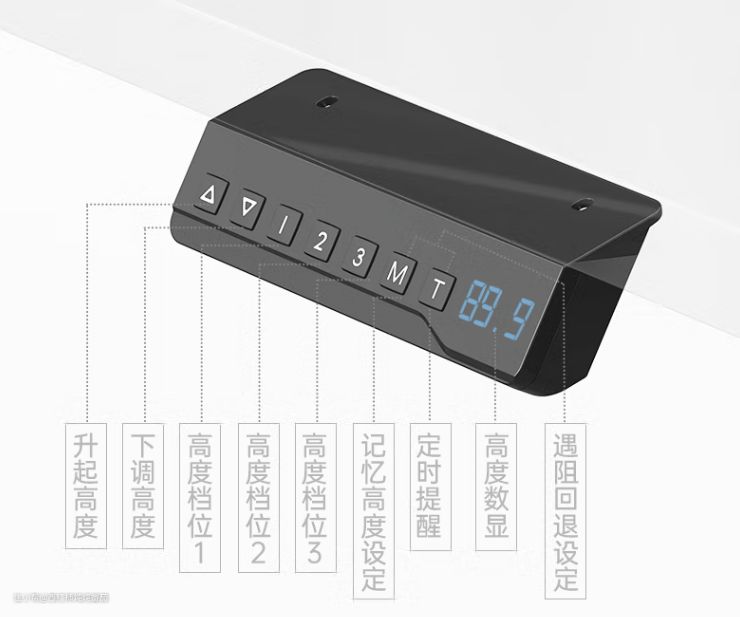 操控方式上,除了调节键和三档高度记忆之外,还有定时提醒,有遇阻回退功能,比前前面两台丰富不少 ▲