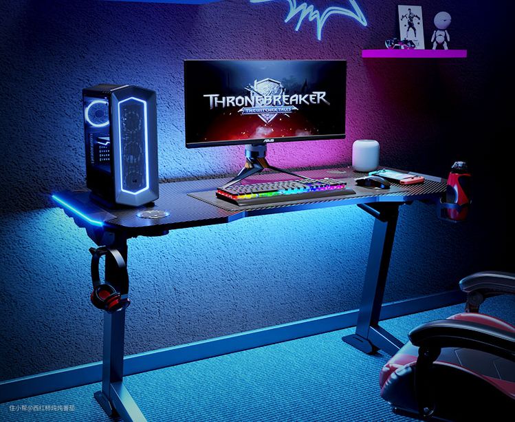 这款GE11-N,呈现出明显的电竞风:桌面采用碳纤维纹理,桌子周边直接自带 RGB氛围灯,桌板和桌腿也是非常规的异形设计,第一眼就给人一种充满个性的感觉 ▲