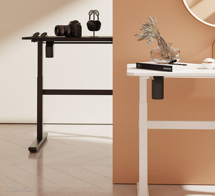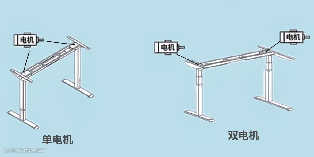 所谓单电机,就是其中一个桌腿有电机,中间一根传动轴,升降的时候带着另一个桌腿一起运动;双电机则是两个桌腿各有一个电机驱动,两者通过一根网线进行信息交互,保证同步运行。简单说,可以理解成汽车的两驱和四驱。