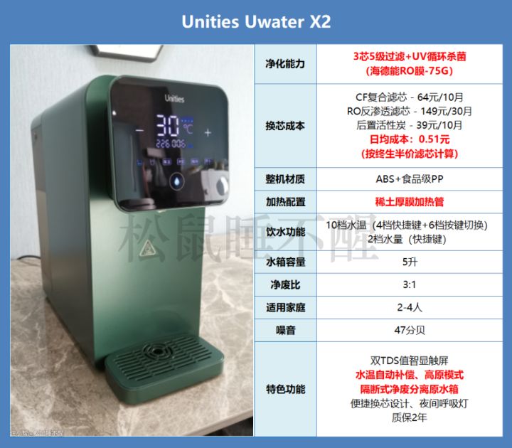 过滤系统是不锈钢滤网+4合1集成一体芯,一年半才换一次,RO膜片采用的是业界公认的陶氏膜,稳定性非常不错。