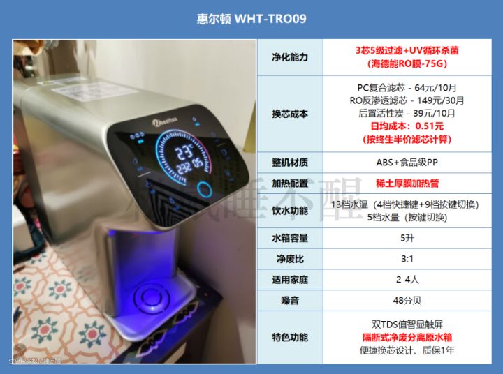 “惠尔顿 TRO09”和“Uwater X2”的基础配置是对标的,“双TDS值智控显屏”改为了斜面设计,操作视角更好。