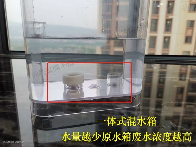“一体式混水箱”就难免会有部分废水被不断的重复过滤,而且水箱内水越少,废水浓度就越高,直到过滤不动了才会提示换水,这无疑加剧了滤芯的消耗。