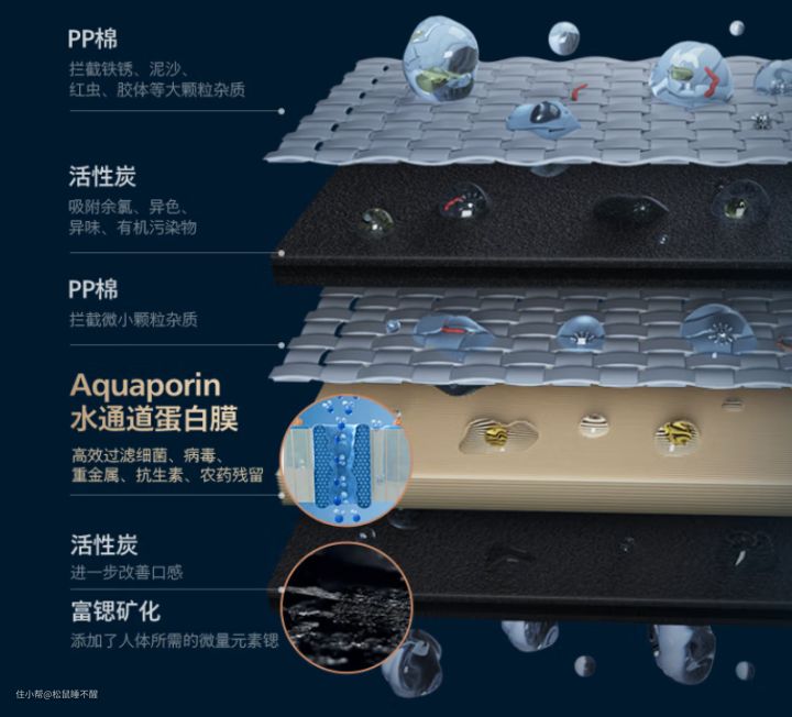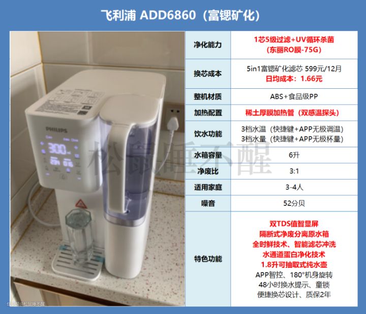 “飞利浦 ADD6860”是22年的一匹黑马,主打“富锶矿化”,5合1一体芯设计,将PP棉、活性炭、高精PP棉、水通道蛋白RO膜、富锶矿化活性炭集于一体,一年一换,操作比较省事儿。