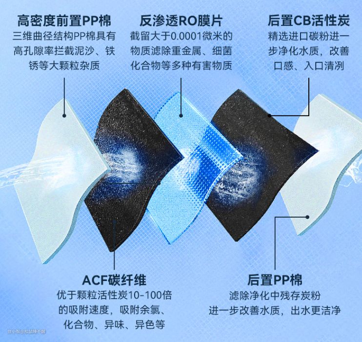 在我们日常体验中,真正带来影响的地方是“换芯频率和滤芯费用”,同样的滤材,但不同的结构(卷膜工艺),更换频率(耐用性)也是不同的。