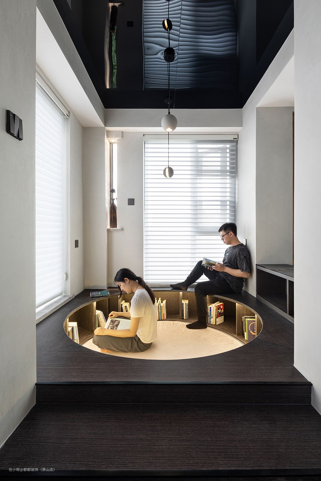 本案的业主最大的爱好就是去书店看绘本,一直希望自己也能拥有一个书店同款卡座阅读室,设计师便将设备阳台改造成了下沉式开放书房。