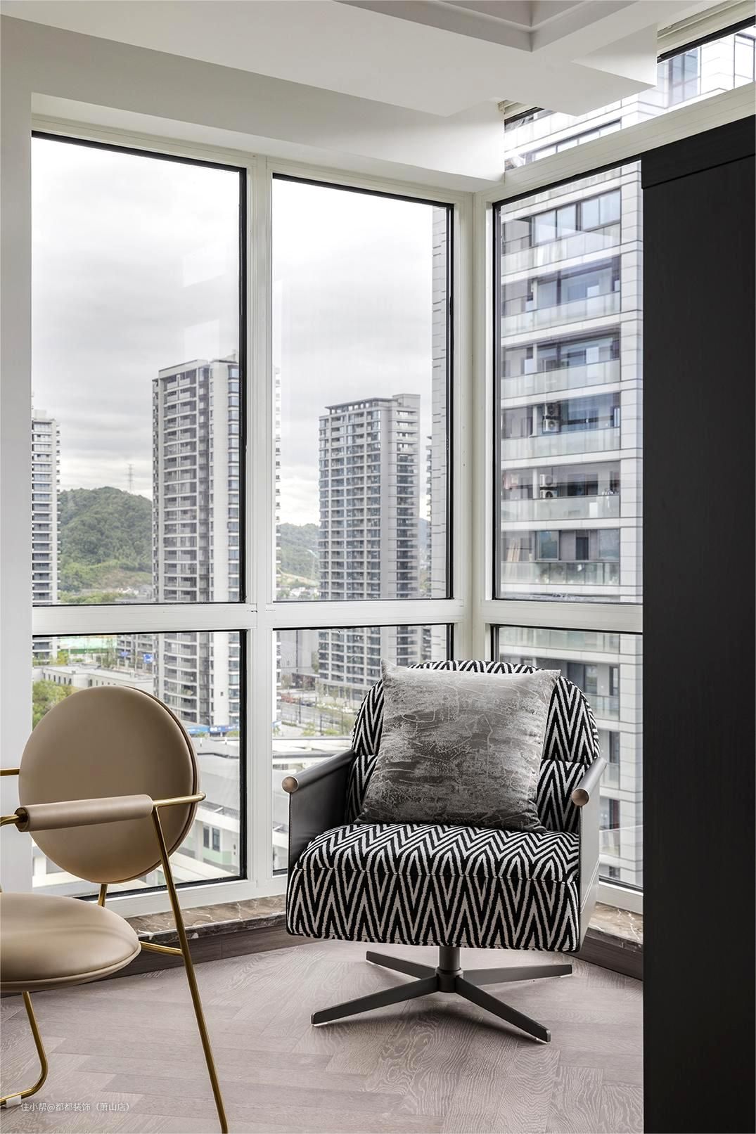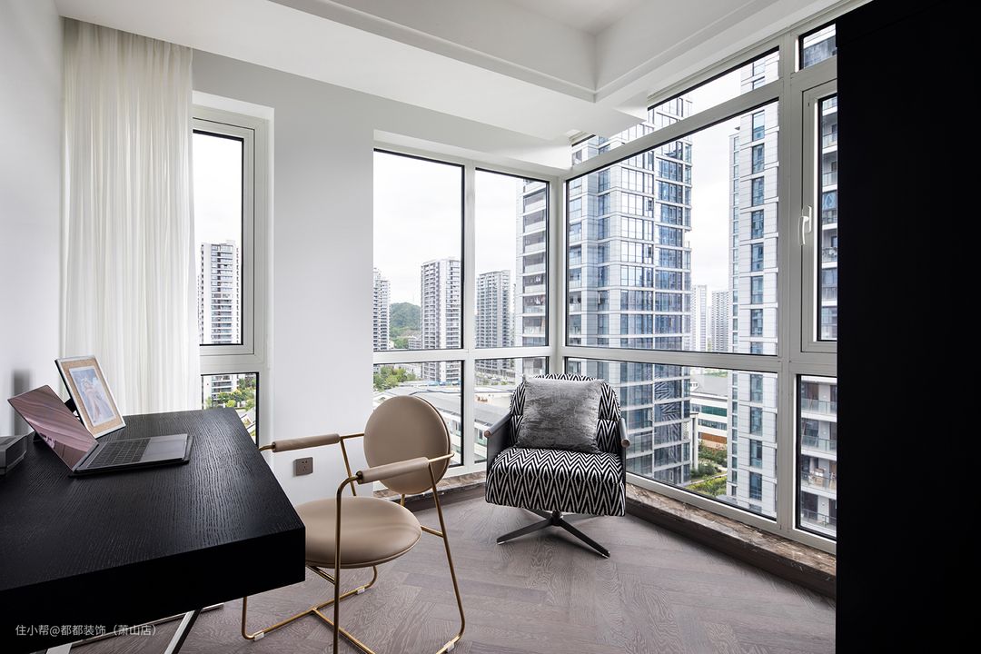 本案的阳台设计成了临时书房,同样也是双窗的布局,采光一级棒,相信这样好的工作环境一定能给业主带来无限的创作灵感。