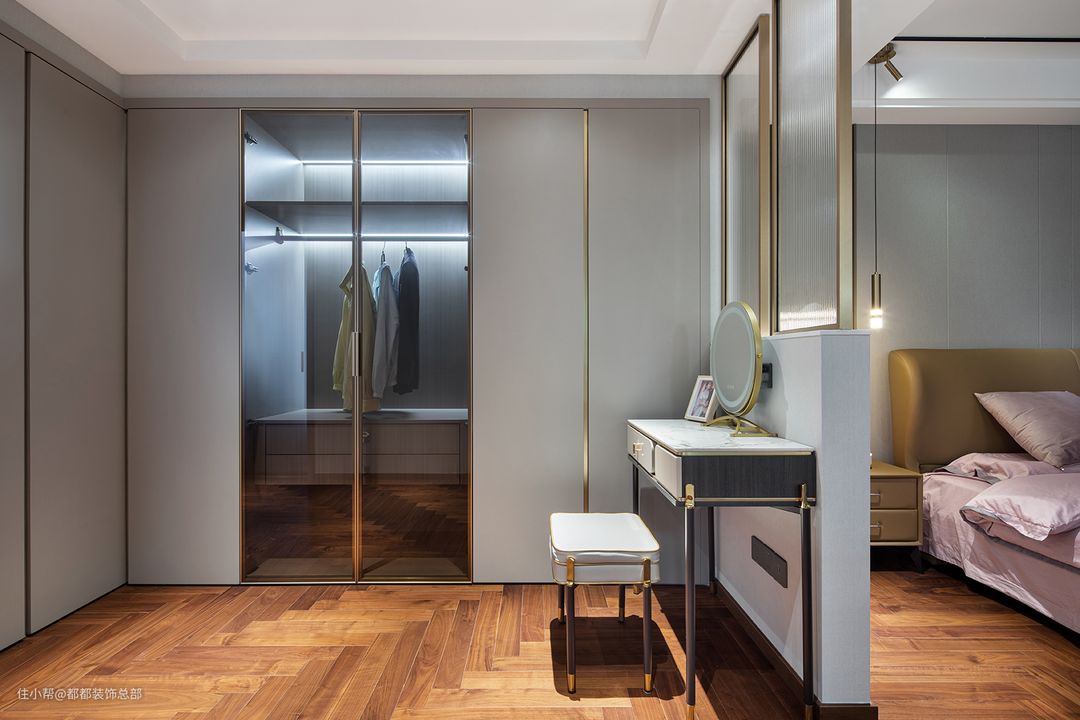 半面墙体+长虹玻璃屏风巧妙隔出衣帽间和梳妆台,智能化妆镜放在40cm宽敞的岩板桌面上还绰绰有余,海量容量的抽屉,口红、粉饼、精华、面霜通通都能装下,桌椅脚统一选用烟熏橡木材质,精致又复古;留出两块玻璃门的衣橱恰当好处的展示常穿的衣服,拿取很方便。