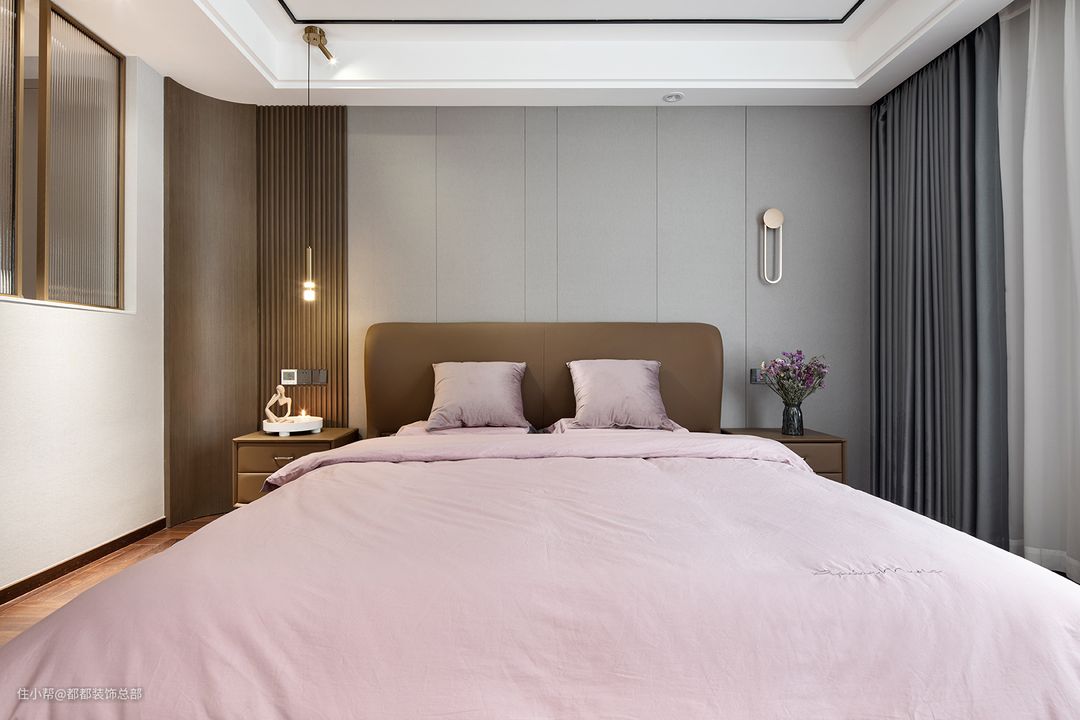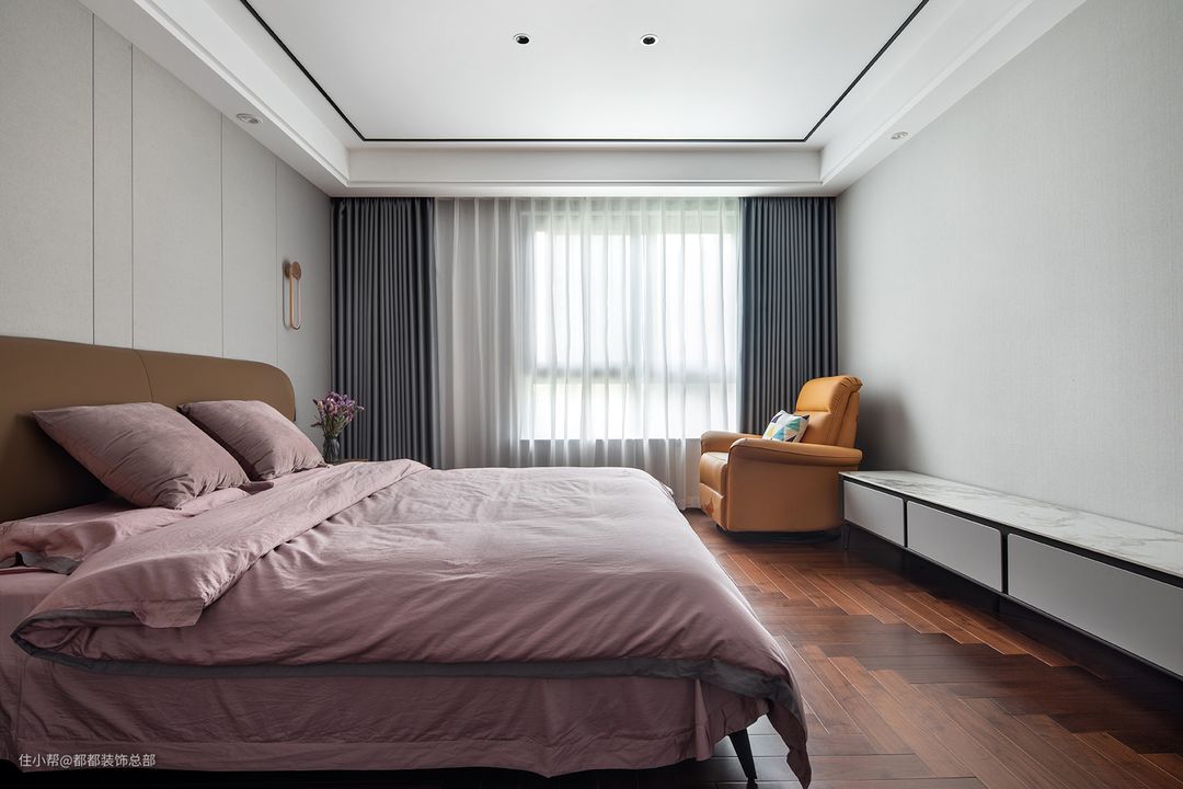 主卧色彩丰盈且充实,窗帘处少量灰色系的运用,给人安稳大气的氛围感;大落地窗设计,以光线与阳光的轻盈,配搭软装的柔和,给予施先生无限的空间温暖。