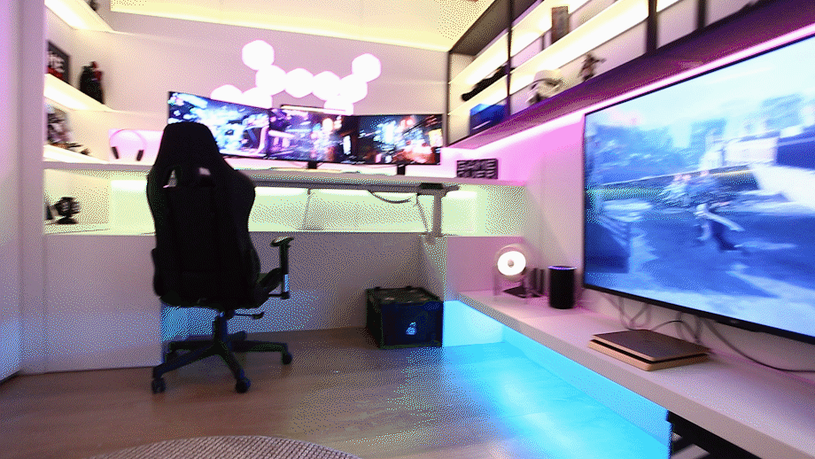 游戏区是电竞房的核心,主要是用来满足居住者娱乐的区域,除电竞桌椅外,一般会配置电脑主机、显示器游戏设备,还可以在这里配置PS5、X-BOX等游戏机,或者配置方向盘模拟器组合等设备,但是通常需要充裕的空间。
