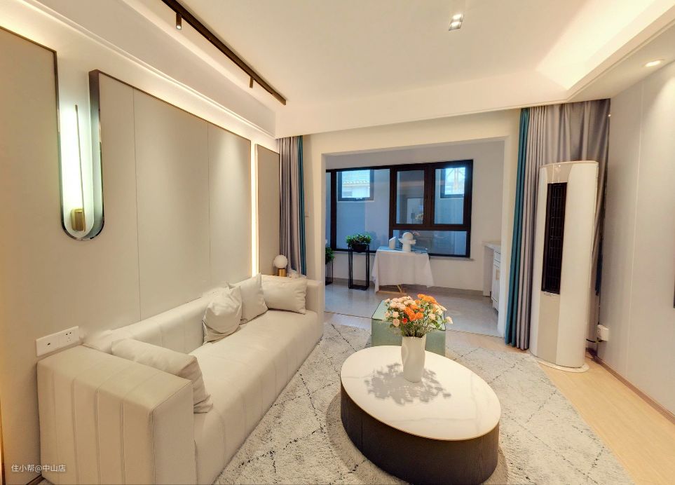 客厅的设置,设计师巧妙地利用阳台的空间,把阳台多余的墙体打通,使得整体的空间足够宽阔。而客厅的整体色系选择则是采用了淡雅的米白色,使得整个空间显得非常的干净素雅。