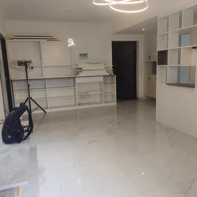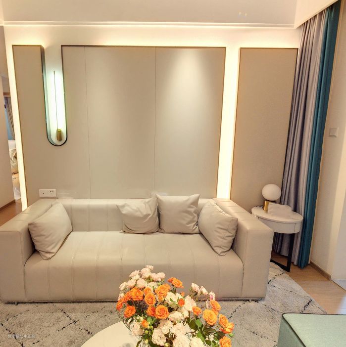 客厅一侧以浅米色的沙发贴墙而置,墙面上以素色背景板装修,中间挖空位置留一盏小灯,灯光照射下来,足够的温馨。而客厅中央的位置则是布局了一张大理石纹的圆桌,桌面上加以五颜六色的花束点缀,更有一番情调。圆桌下方也就是客厅中央的位置的地面以素雅的地毯铺垫,整厅显素雅大气。