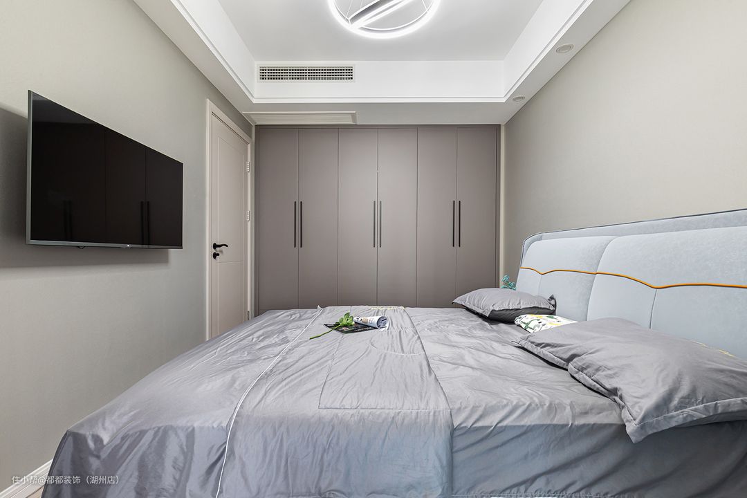 灰色衣柜搭配蓝色皮质双人床,简约大方,处处都可以看到主人对于生活品质的重视