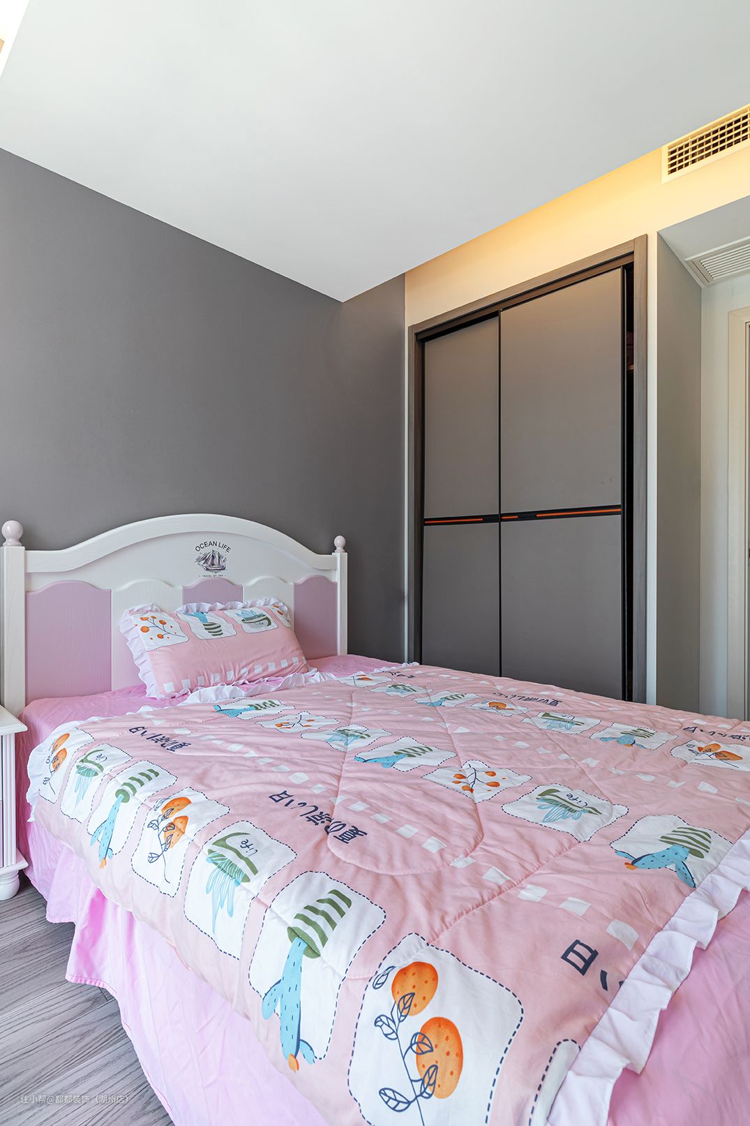 浅灰色墙面、原木地的板搭配很好的压下了床品的浮躁和喧哗,随着孩子的长大,只要替换相应的软装,很轻易能打造出更为高级的空间。暗藏式的灯带,让光线散发的更为柔和