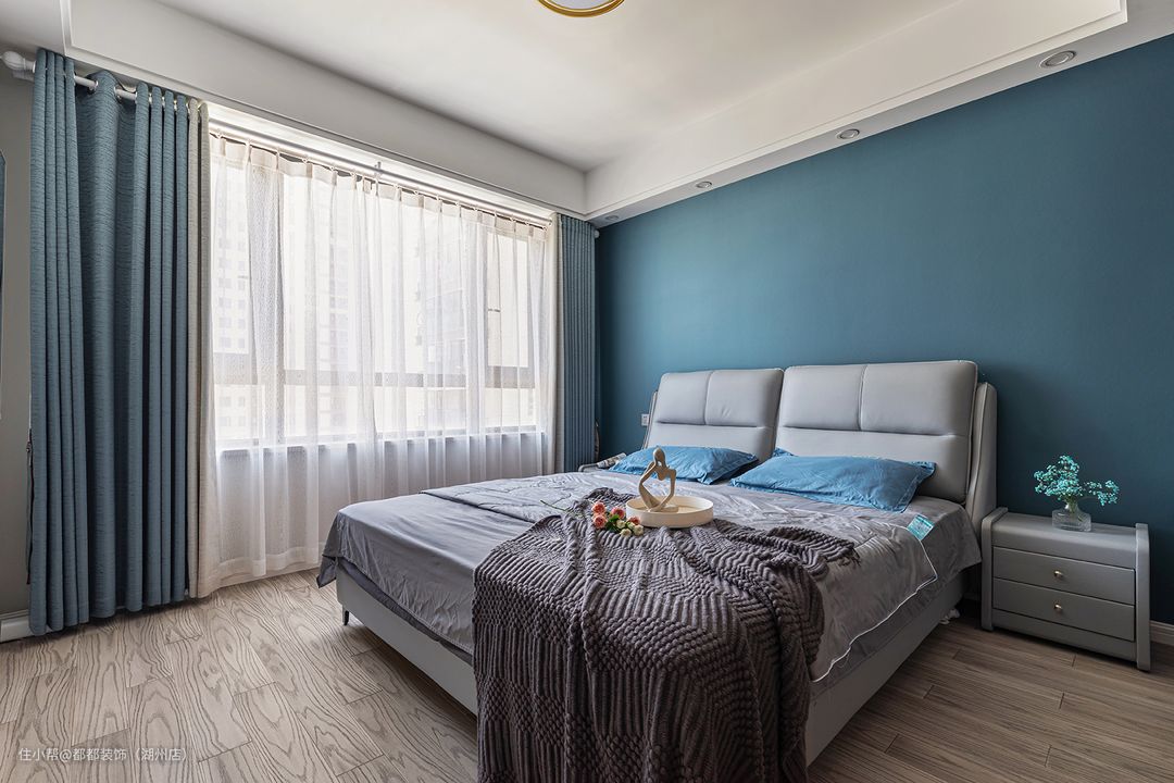 卧室设计以简胜繁,整个空间流淌着深浅不一的蓝色,搭配素雅的实木地板,使空间中洋溢着宁静温暖的气息