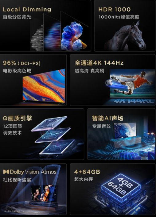 TCL新推出的Mini LED量子点广色域电视,整体配置比较出色,价格合理,很值得入手的大尺寸高配置电视。峰值亮度达到了1200nit,控光分区数量分别为惊人的448个。支持98% DCI-P3广色域,支持120Hz高刷屏幕,搭载领曜芯片M1+A73四核芯片+4G运存,支持杜比视界和杜比全景声,支持60W大腔体音箱系统。TCL这次算是放大招咯,适合对大尺寸电视有较高性能要求的小伙伴。
