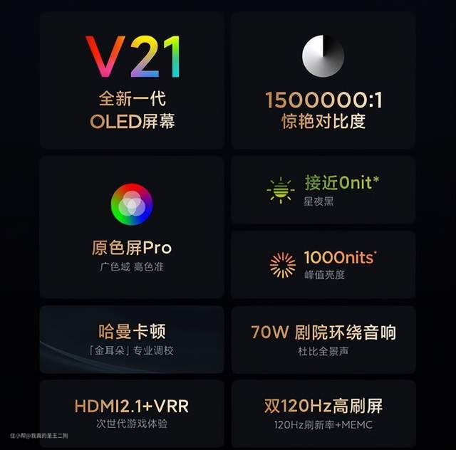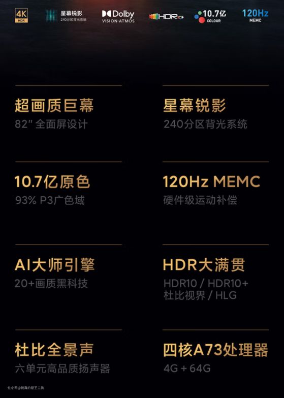 电视大师系列是小米旗下的高端电视型号,这款也是目前小米旗下配置最高的OLED电视。A73四核芯片+8.5G运存,堆料上十分豪华。支持HDMI 2.1和120Hz的刷新率,主机游戏玩家的梦想电视,这也是XBOX的官方合作电视(。峰值亮度达到了1000nit,作为一款OLED产品来说表现还是很给力咯。强大的音箱系统,70W全功率+哈曼卡顿调校,配合杜比视界、HDR10、杜比全景声,在家可以享受到出色的音画体验。 MEMC,广色域,语音助手都是有的,配置可谓全面又豪华。