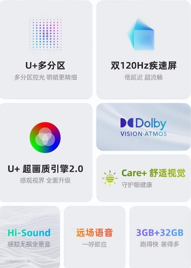 U7H系列主打画质性能,同时兼顾游戏需求。画质方面海信U+超画质芯片的加持,进一步针对画质进行提升。全功能HDMI 2.1接口+144Hz高刷新率+MEMC,轻松匹配各类主机满足游戏需求。77W多声道空间声场和自研Hi-SoundPro天籁引擎的引入,音质表现也明显提升。A73四核芯片+4G运存,系统流畅,应对战未来也十分轻松。峰值亮度达到了1000nit,带256个分区别光系统,HDR效果不错。不过稍显遗憾的是屏幕色域只有90% DCI-P3,总的来说性能比较不错,算是中高端好选择。