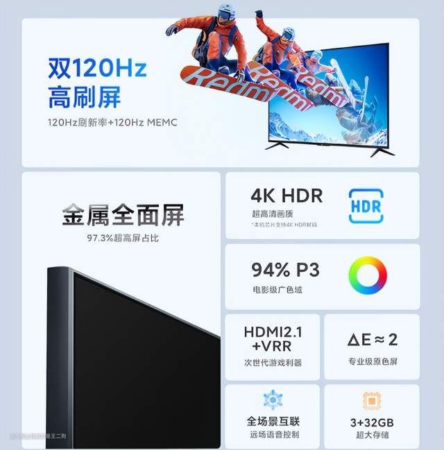 从定位和配置来看,依旧是延续上一代产品的思路,偏向入门性价比的产品,不过依旧有不少亮点。最大亮点就是支持HDMI 2.1和120Hz高刷屏,简单来说就是对游戏玩家比较友好。硬件配置上,A73四核芯片+3G运存,系统运行流畅度没问题的。P3色域达到了94%,支持MEMC运动补偿,峰值亮度450nit,对应这个价位来说硬件堆料还是不错的。