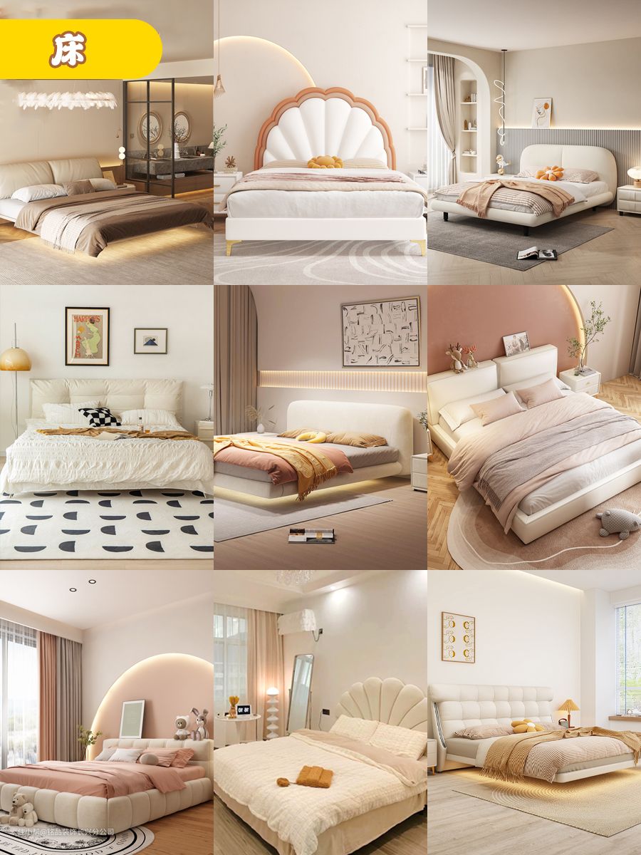 7.奶油风的床真的充满少女的梦幻气息,在主体的烘托之下,床体的柔软和典雅气韵呼之欲出: