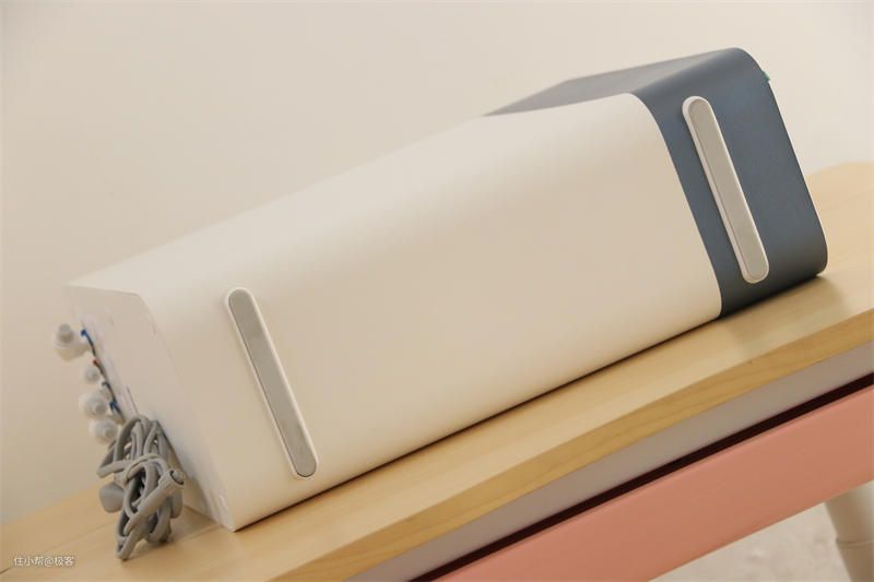 这款云米Super Y 净水器的外观设计非常的简约,全白色的机身搭配前端的蓝色绶带条,给人一种小清新的感觉。