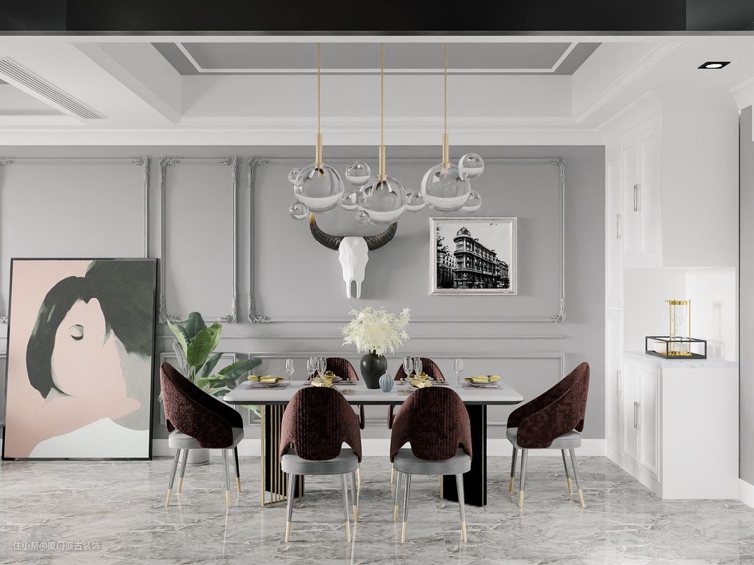 最后我们看看餐客整体的效果,长条的一体餐客厅设计特别适合这种法式风格,整体看起来十份大气磅礴,典雅又高端。如果您也是如此有品位的人,不妨试试这略带轻奢的法式风格吧。