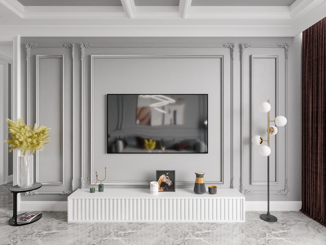法式风整体以大面积的白色墙面为基调,比较典型的法式风元素就是墙面上大量的对称设计的方框类浮雕纹饰。