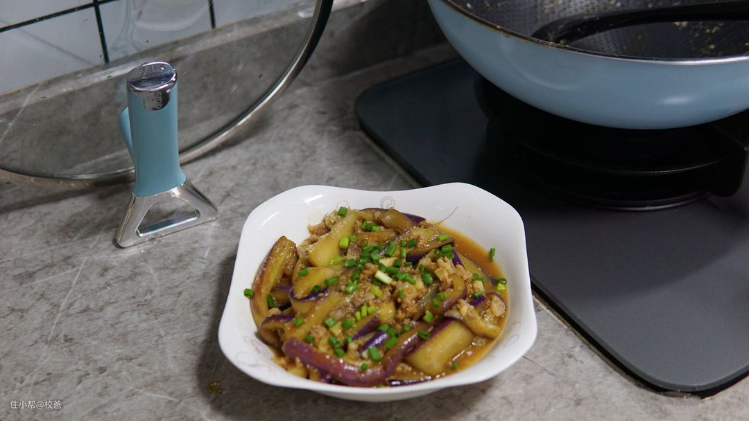 加一点豆鼓油翻炒,撒上葱花起锅,一道美味的肉丝茄子便呈现在眼前。