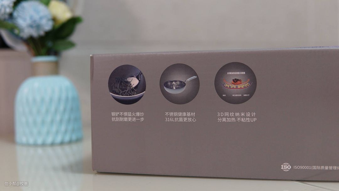 包装的侧面醒目地标注着GiPP居派晶刚盾II抗菌复合钢炒锅的产品特性,让一人目了然。