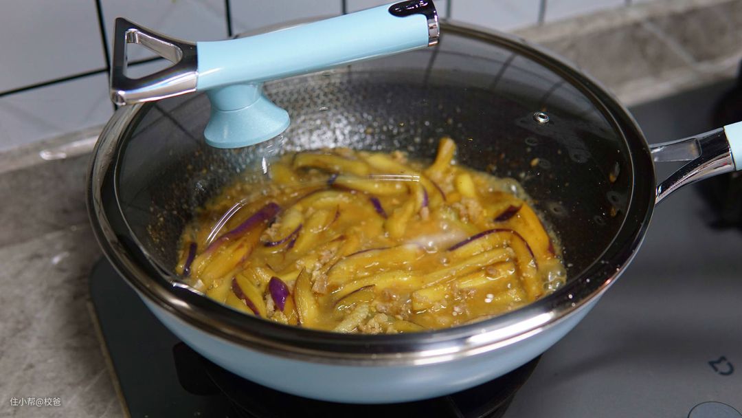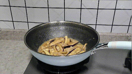 倒入茄子,加少许清水,放适量老抽,盐等,快速翻炒,然后盖上盖子。