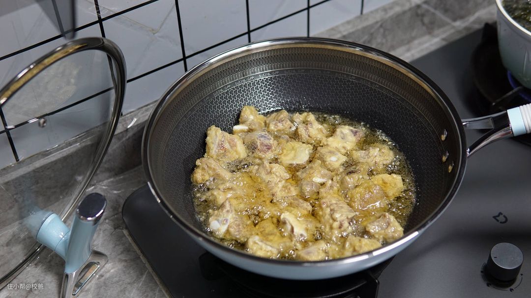 不停的翻动排骨,炸至排骨炸两面变金黄色,再转小火炸至排骨内层熟透,再起锅即可。