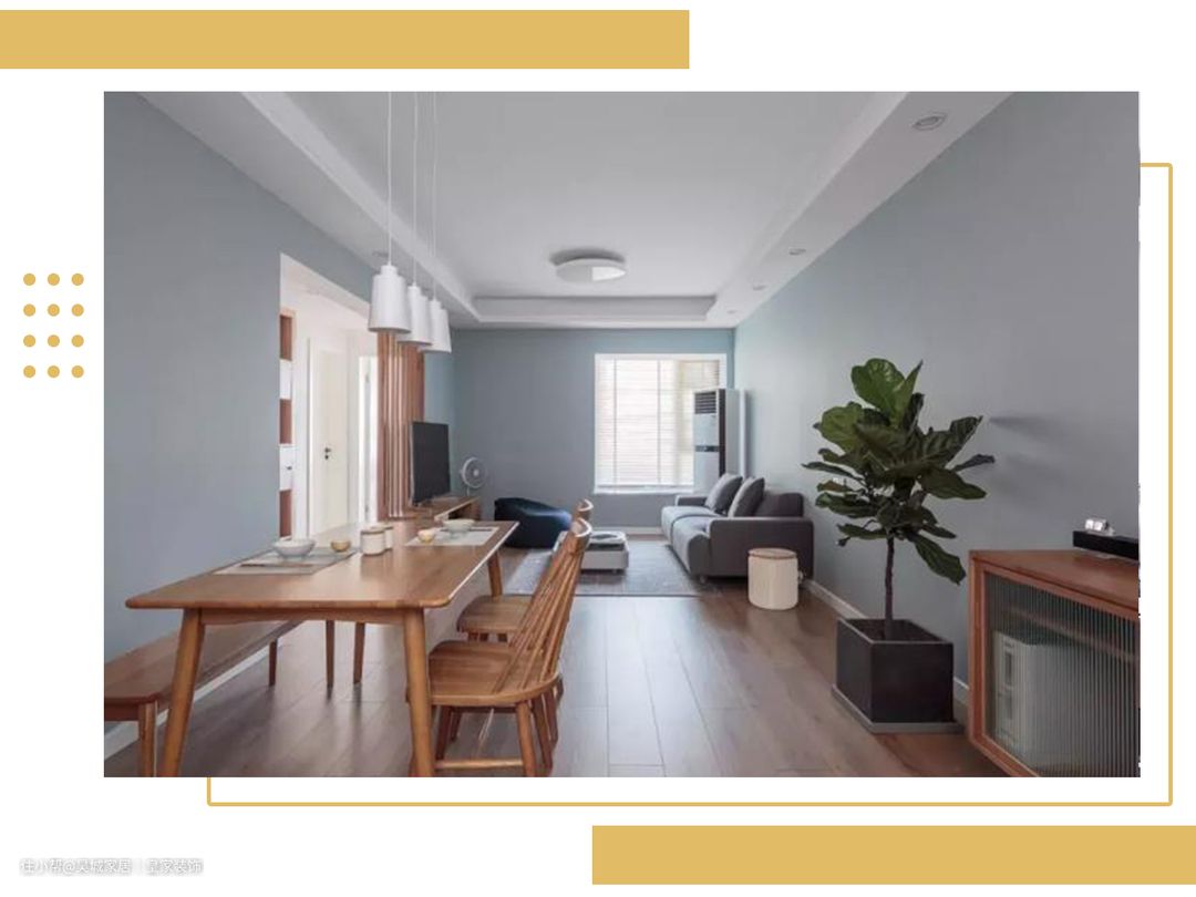 二 浅蓝灰 光是看到这个颜色,相信大家都会不由自主的想到北欧风,它自带北欧风清新舒适的感觉,如果希望回到家可以感受到安静、远离纷扰的氛围的话,蓝灰色一定是个不错的选择,搭配白色墙面、木地板、绿植、布沙发,就是一个完美的北欧风了。