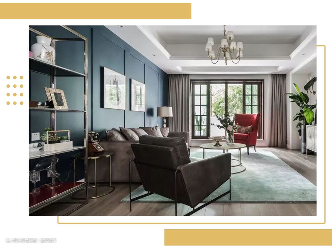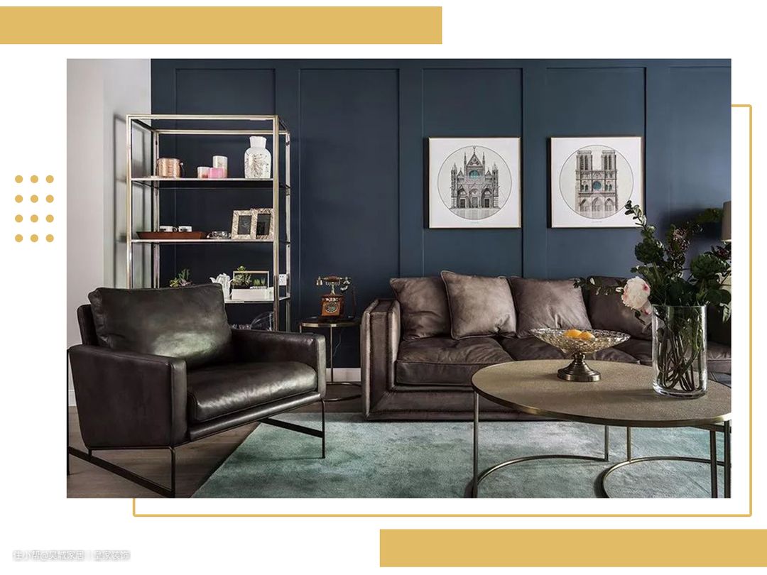 三 藏蓝 这种颜色比较深,复杂或简单的风格通通都合适,但不适合大面积涂刷,而作为点缀或使用在软装搭配上是非常适合的,一般都会选择沙发墙来涂刷,再搭配上石膏线或者挂画,整体空间就显得非常有气质。