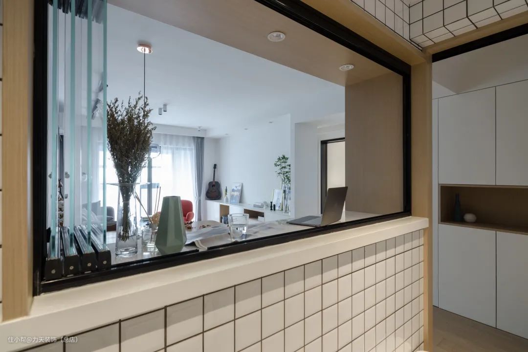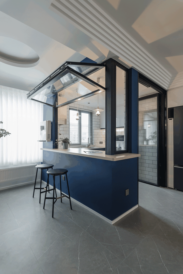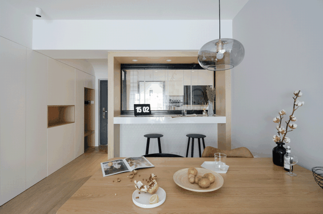 想在下厨时与家人有更多互动,或者方便传菜,不妨在厨房加装能自由开关的玻璃窗,能随时打开与客厅、餐厅串联,不仅能当出餐口使用,还能增强通风;玻璃窗下方顺势加装吧台,打造简单的就餐区,简直是小户型福音。