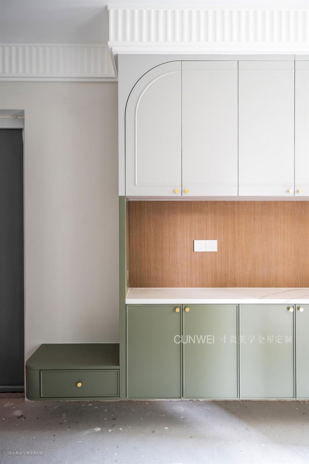 入户在电视背景墙同侧,客厅电视背景墙装一整面收纳柜,不要电视,以增加收纳空间为主。卡座玄关收纳柜+餐边柜+家政柜,感觉能让家住个10年也保持干净、整洁。