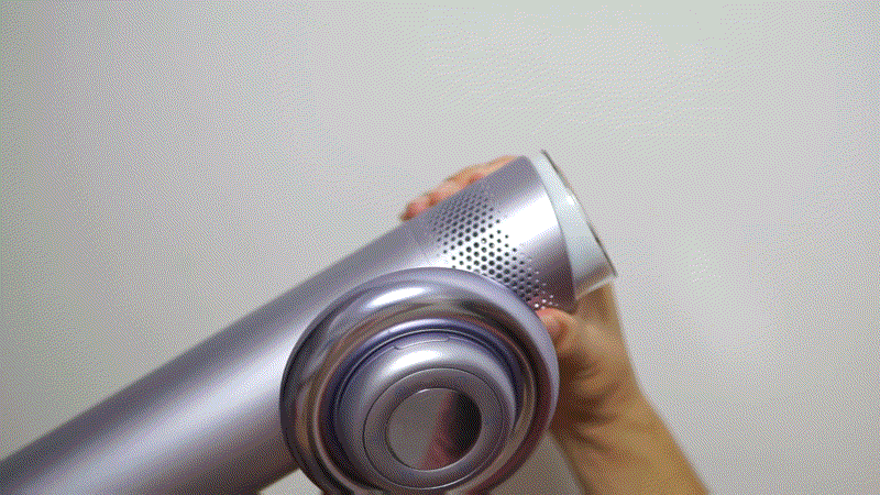 这台吹风机功能区域,主要是上图这个像麦克风的部位,中间两个圆圈就是出风口,进出风跟普通吹风机的设计不同之处,这台吹风机有两个吹风口,两处进风口。