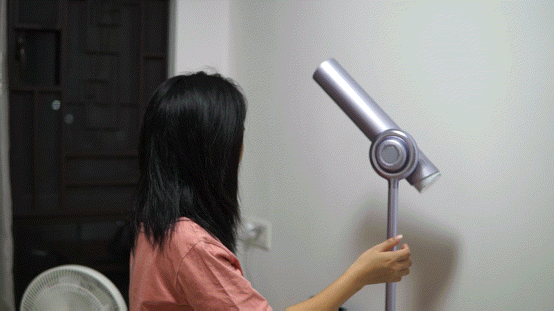 组装完成后,通过支撑杆可以调节高度,通过直接抓住吹风机,旋转到合适的角度,高度和吹风角度功能都属于无极调节,整合较合理,调节时稍微费力,这应该是考虑到固定高度和角度后的稳定问题。
