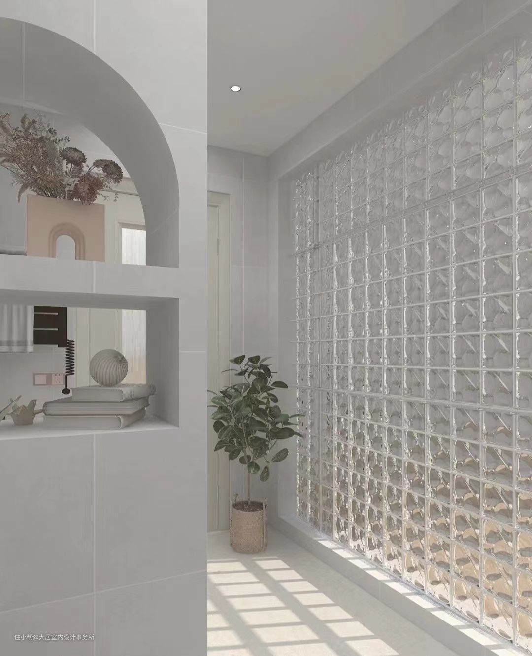 实体墙会阻挡外面的光,因此可以将瓷砖改为玻璃材质,或是选择玻璃门改善采光。