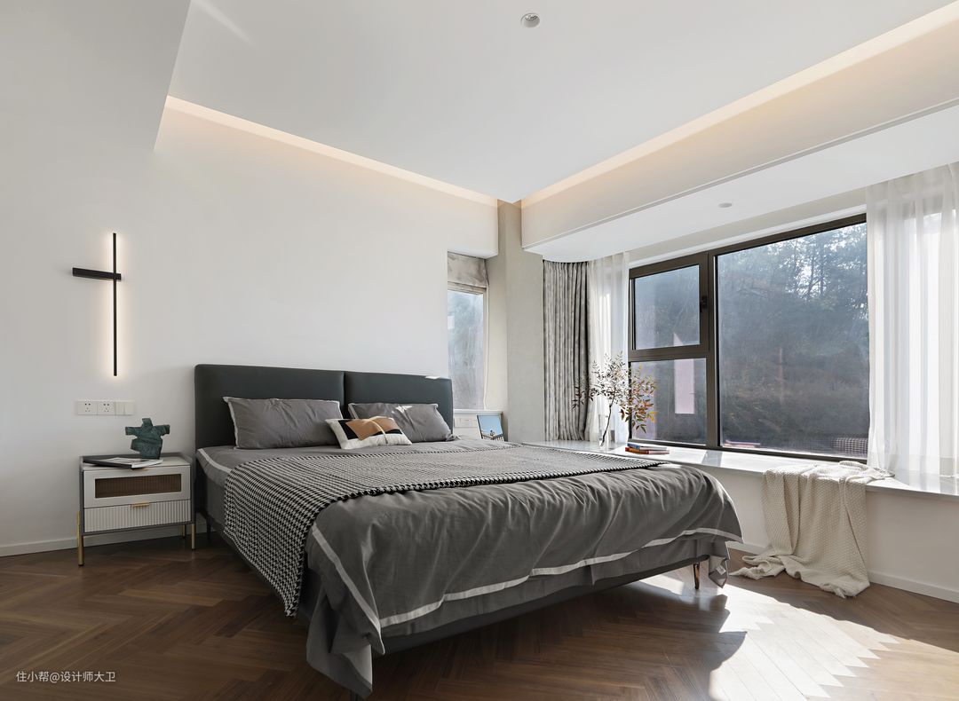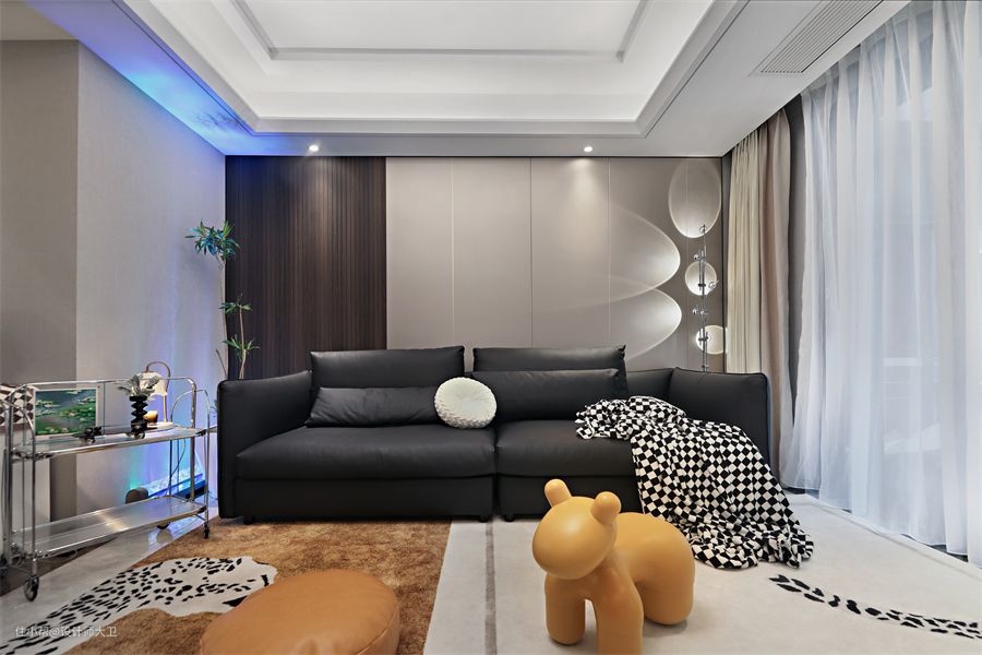 现代简约风格装修设计适合用布艺来体现,一般适合用几何图案或者简单大方的线条图案等,因此地毯和窗帘都可以选择一色的或者带有几何图案的色块比较分明的来搭配。
