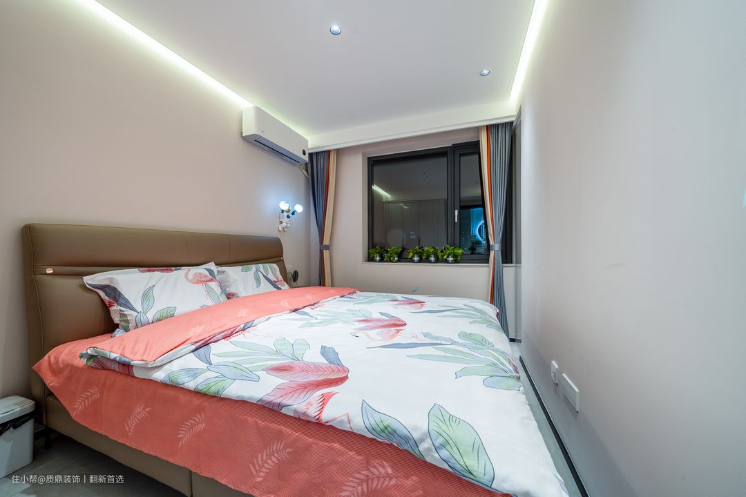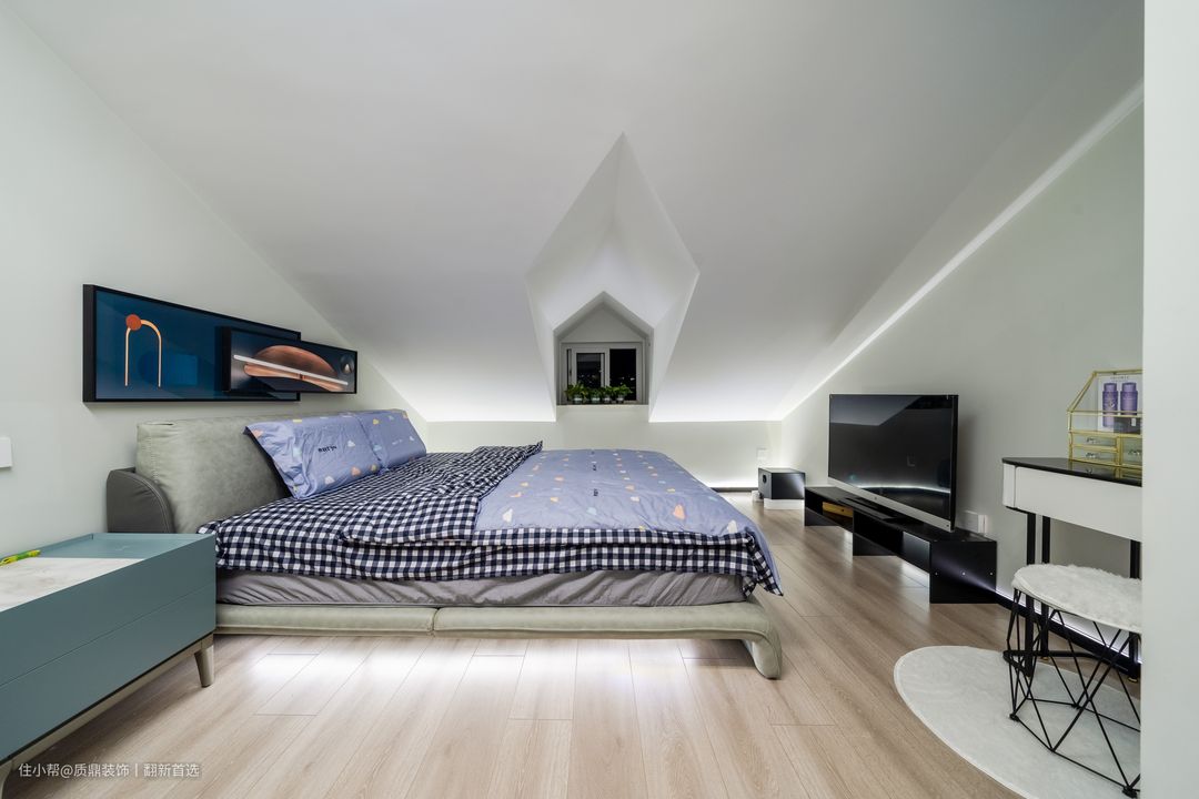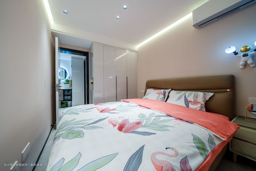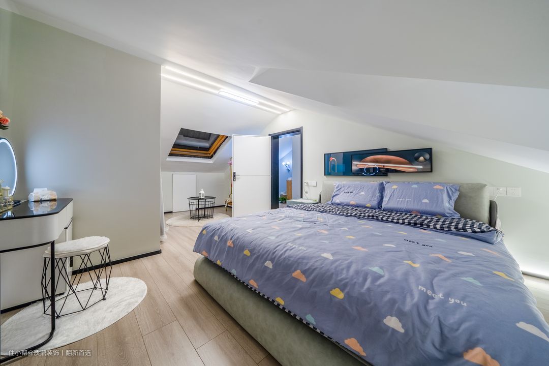 从主卧借出一部分改成楼梯后,空间比原来缩小,摆放完大床后刚好有通行的空间,进门的墙面正好打造壁柜储物;无主灯的设计在小空间刚刚好,大气又简洁,空间虽小,但不失温馨感。