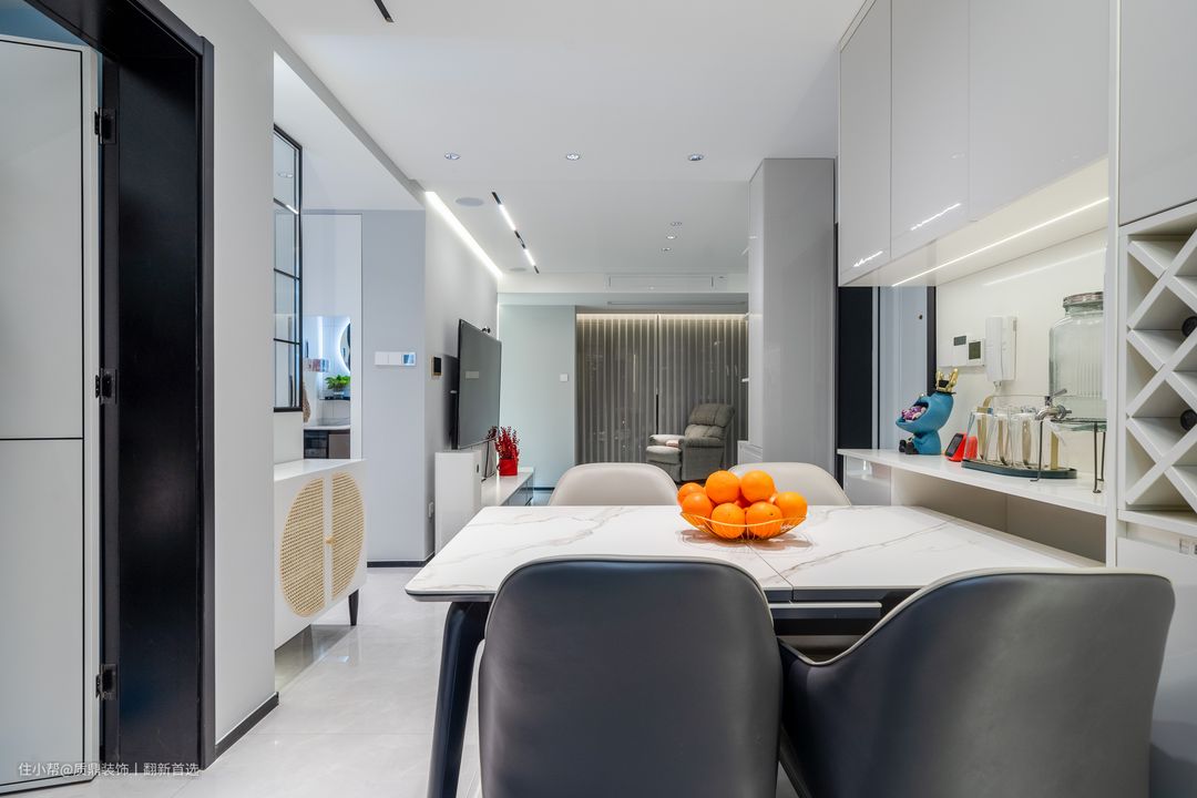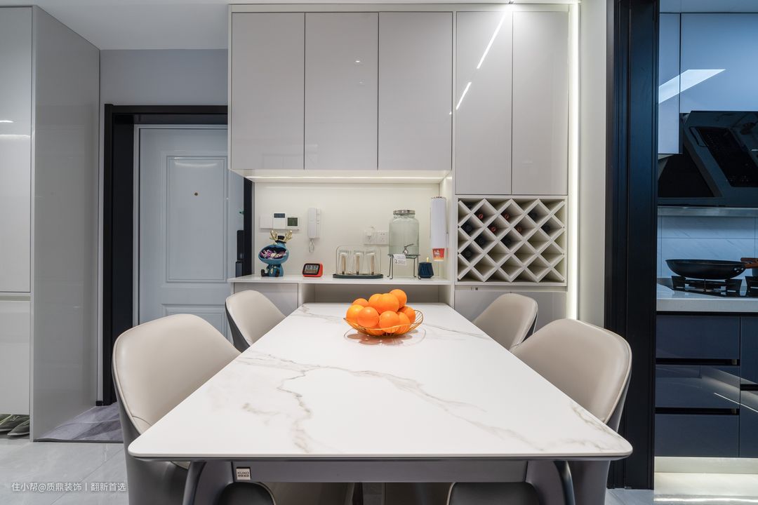 长方形的餐桌迎合了整体的简约风,灰、白色的搭配也符合整体的配色。