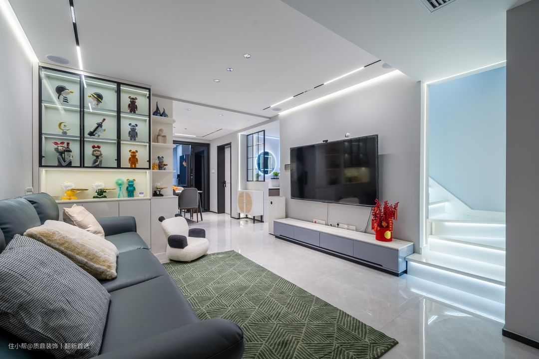 客厅深度不够摆放楼梯的位置,利用主卧部分空间做楼梯;楼梯入口在客厅电视背景墙,加入灯带的设计反而带来时尚感。