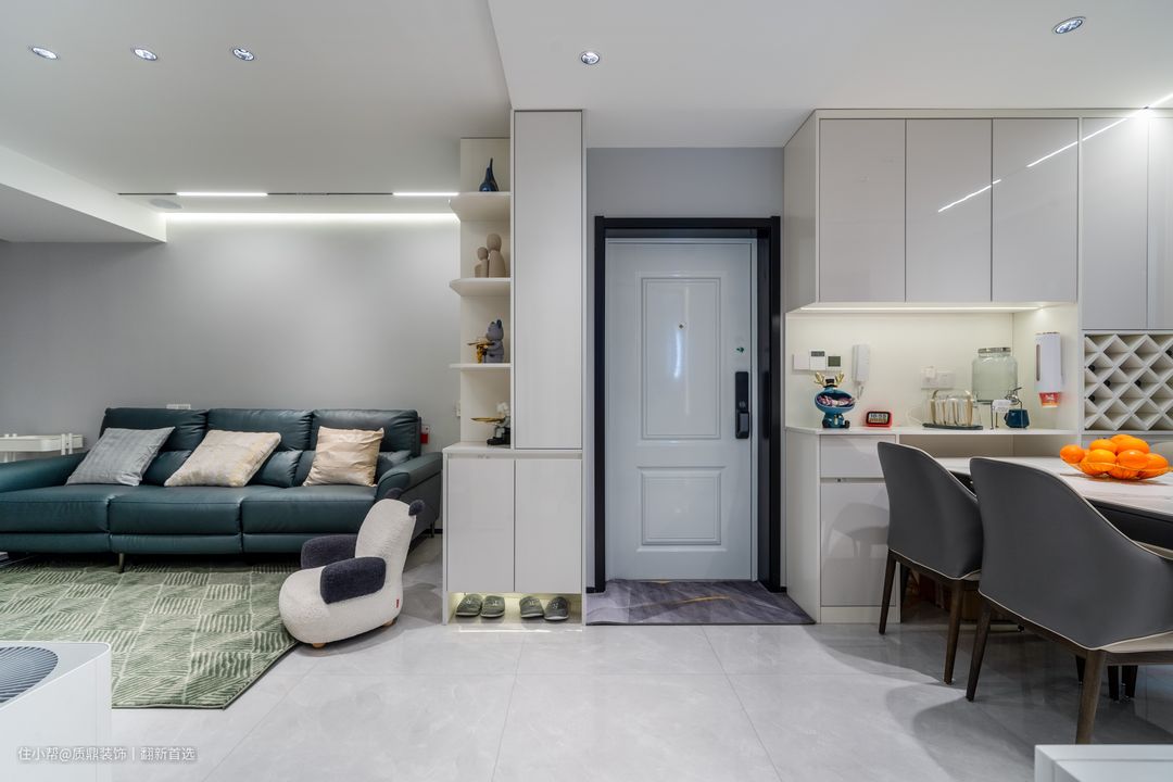 门厅位置充分利用,一边设计鞋柜,一边是餐边柜,收纳充足。左边的玄关柜深度加宽,刚好是客厅的边柜。