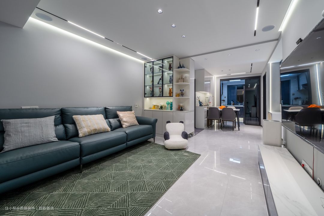 雾霾蓝的皮质沙发,没有茶几的摆放,搭配一张地毯,将抽象的理念落实到实地生活当中,空间更显大气简洁。整个空间采用无主灯设计,追求宽敞明亮的空间,强调整体结构的完整性。
