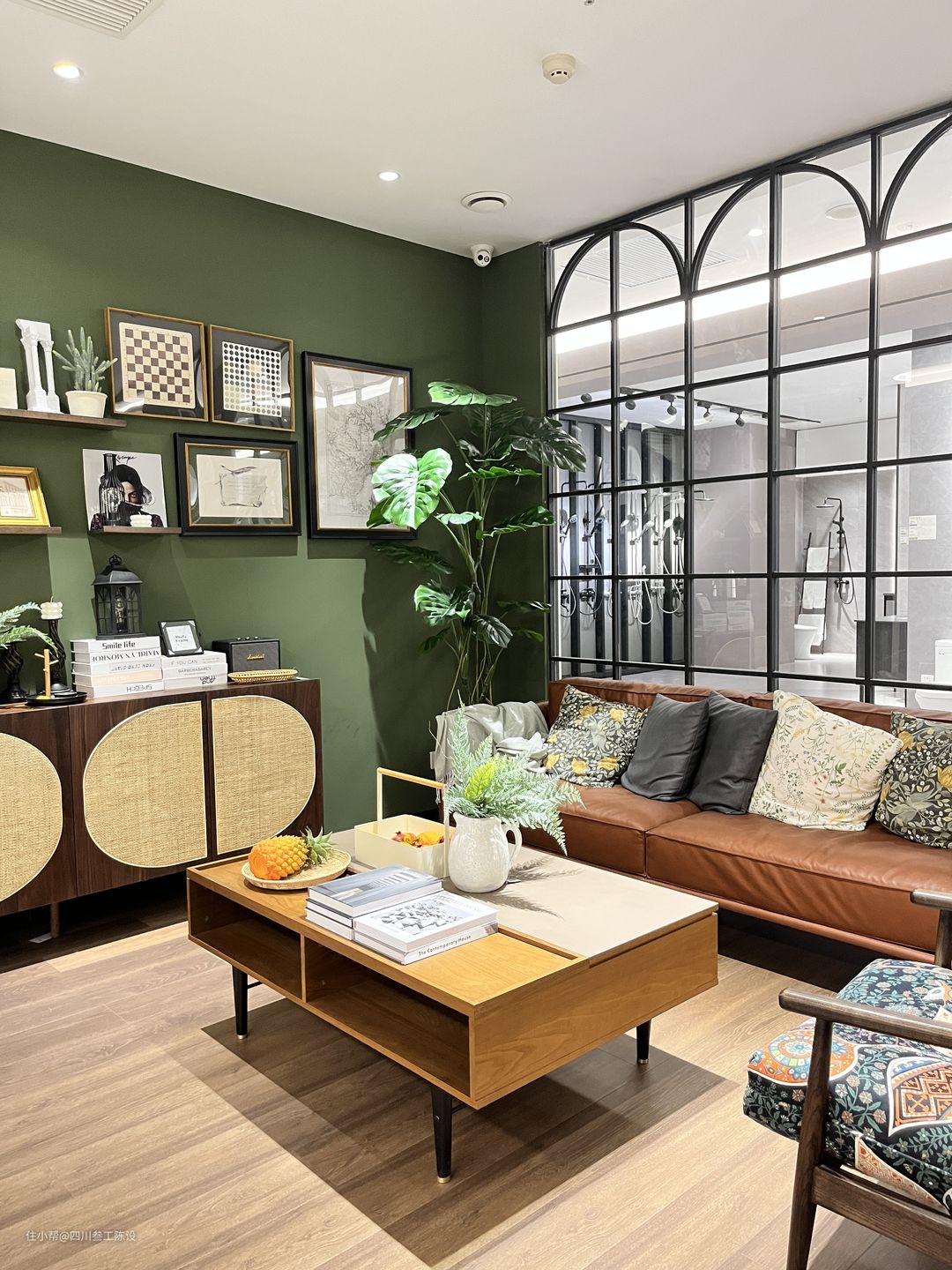 客厅空间的角落用绿植填充,绿色的墙体和空间整被赋予了新的定义,每本书和每个空间的放置,都是很舒适的,绿色的背景下,每寸空间都得到很好的规划,在这个浪漫的南洋复古风空间之中,一切的舒适都变的极有意义
