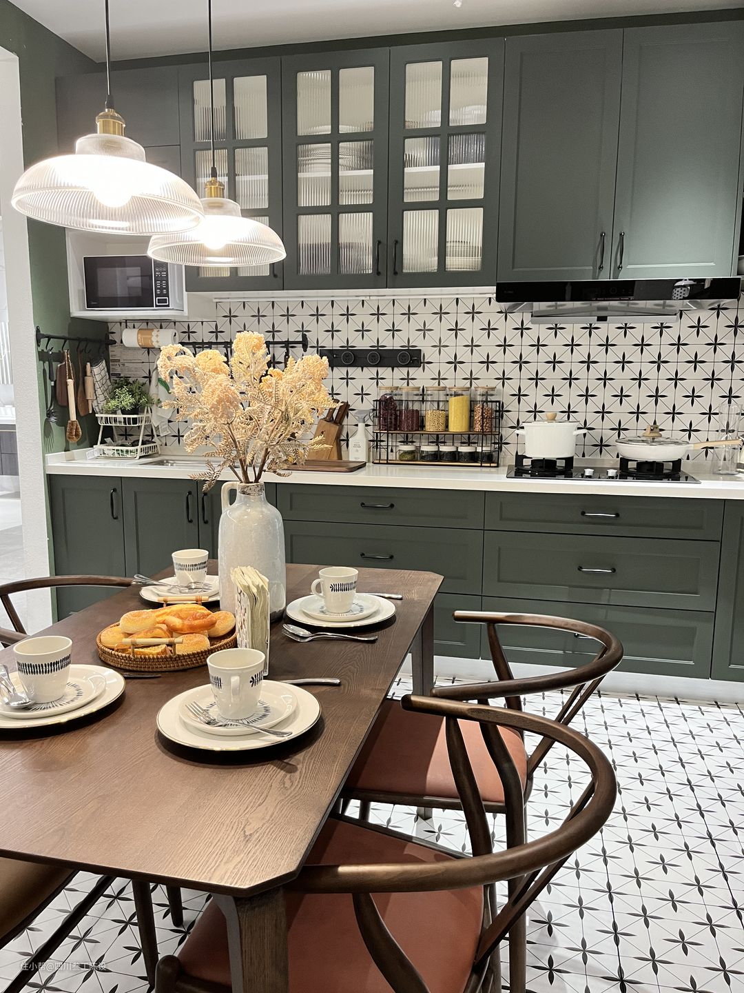 户型空间比较小,就做的餐厨一体设计,精致的餐厨空间中,所有的布局和规划都安排的比较满,厨房做的一体式厨房,餐厨空间也显得精致,地面的瓷砖是一种碎花纹,让空间显得比较的富有填充感,吊灯的设计也很是温馨,小小的餐厨空间中,独具特色。