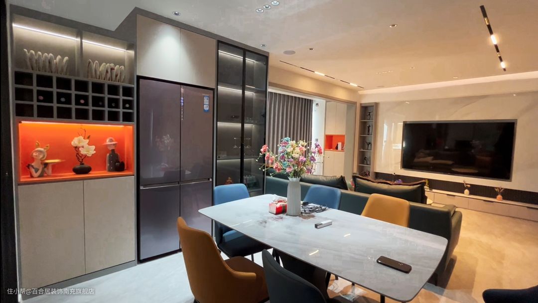 冰箱内嵌到餐边柜,整体性更强。冰箱位置非常合适,位于整个空间的中心位置,到客厅、餐厅、厨房的位置都很近。天然岩板餐桌,耐刮耐磨,摆放上花瓶点缀,桌面不会显得简单