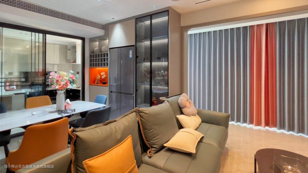 灰色北欧轻奢沙发与餐椅风格统一,色彩搭配比较跳跃,用色彩突出空间的活跃气氛,若仅用黑白灰三色+简单线条装扮,空间则会显得过于单调,无法满足业主的需求