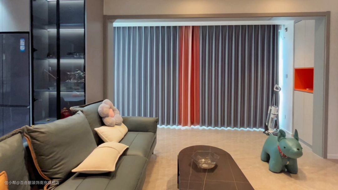 瓷砖通铺至客厅阳台,光线可以直接照亮整个客厅,窗帘使用电动窗帘,坐沙发上即可控制,不用起身。保证房间充足的自然采光,不仅减少电费支出,而且自然光线相比灯光光线更护眼,光线强度也更高。