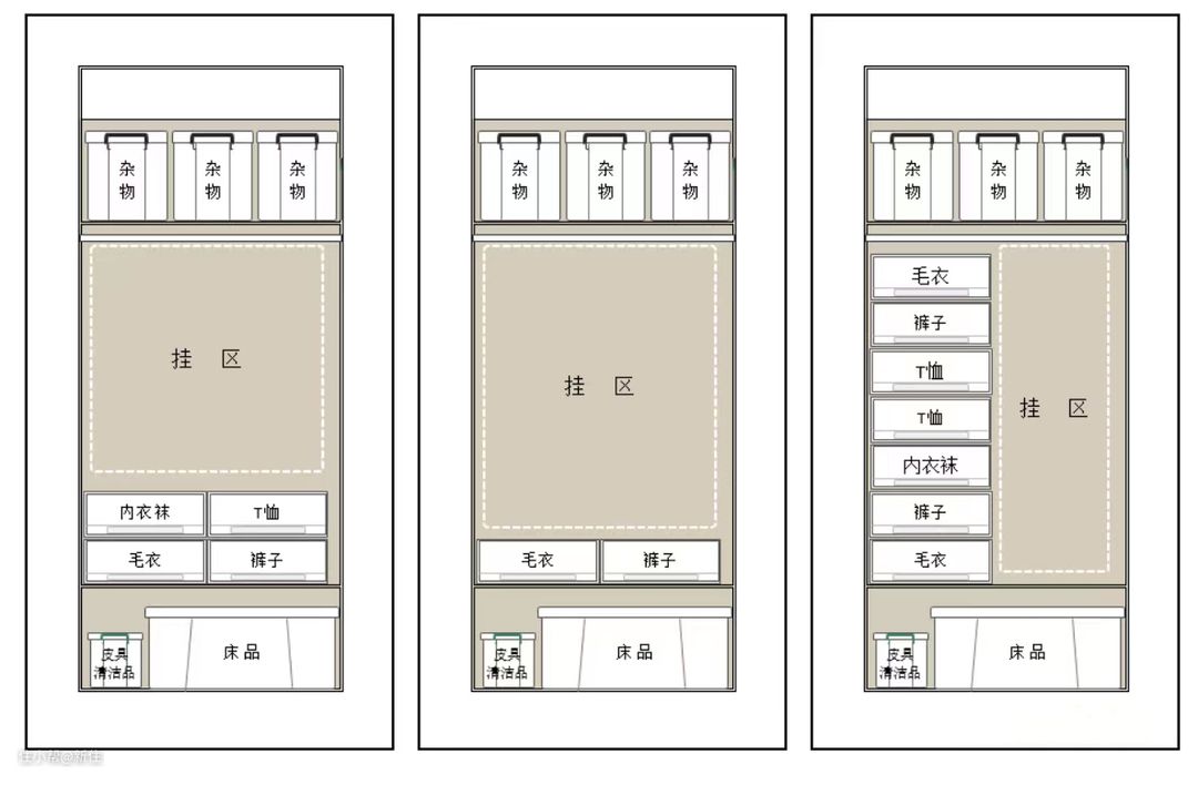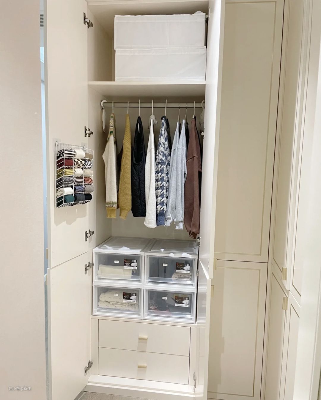 其实,我们完全可以不要叠衣区,甚至不要任何隔板,给柜子里面就做一个挂衣杆,然后布局,靠着抽屉式收纳箱来完成。